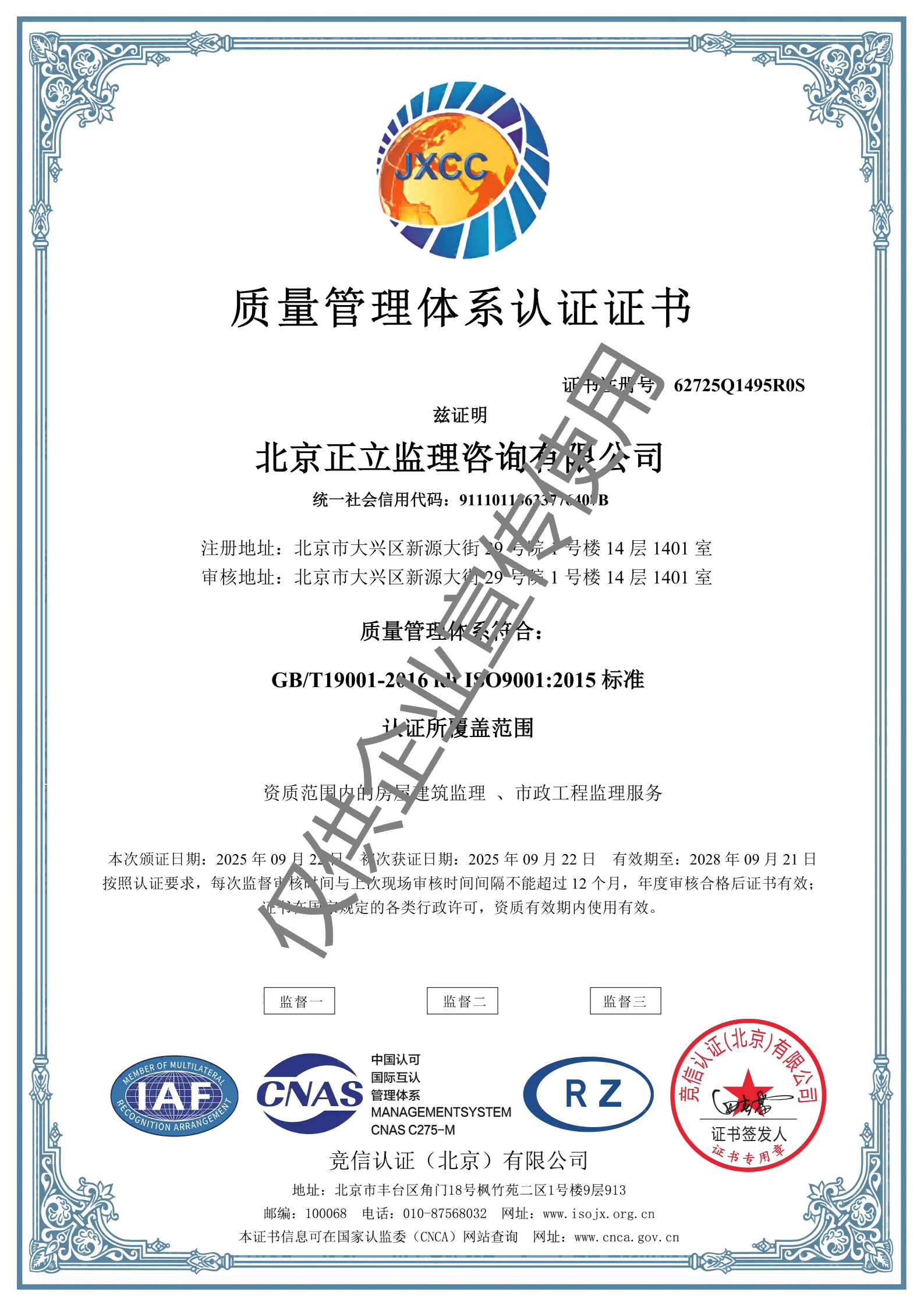 北京正立監(jiān)理咨詢有限公司成立于1998年7月1日,其前身隸屬于北京市公路質(zhì)量監(jiān)理站。具有獨立法人資格,是獨立核算、自負盈虧的經(jīng)濟實體。企業(yè)經(jīng)營范圍:公路工程監(jiān)理、交通工程監(jiān)理、市政公用工程建設(shè)監(jiān)理、工業(yè)與民用建筑工程監(jiān)理、工程監(jiān)理咨詢、技術(shù)咨詢、技術(shù)培訓等。